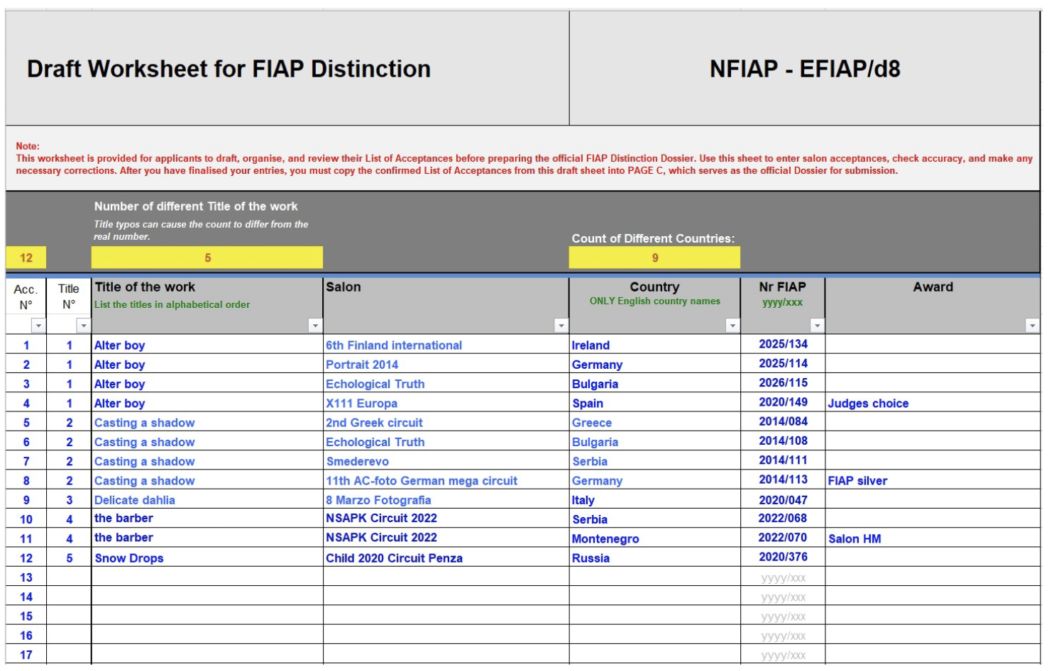 The document needed for recording your acceptances is ‘Draft work sheet’ that FIAP has provided. This can be found here under the ‘FIAP Application Forms’ tab as well as on the FIAP website: https://www.fiap.net/en/services/distinctions-service